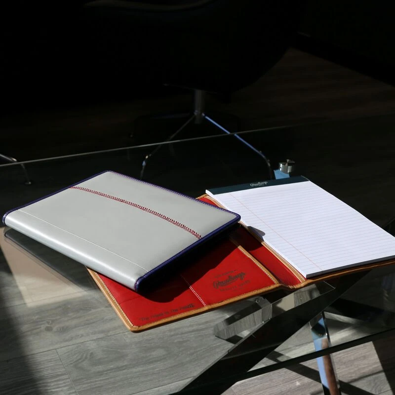The Rawlings “pop” baseball stitch portfolio tablet case is crafted from premium leather and features vibrant colors to match your style. These portfolios include a Rawlings paper pad, and have 6 credit card slots and 2 business card slots to keep your things organized. It’s also equipped with two 8.5″ x 11″ slide pockets to keep documents safe, an can hold a tablet up to 9″ x 7″ too.