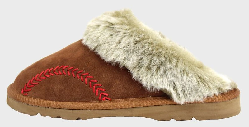These women’s baseball stitch slides offer unique style and fashion for baseball moms and softball players alike. The mule cow suede provides great quality while the faux fur lining gives unmatched comfort and style.